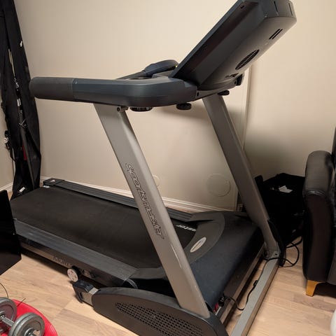 Løpeflaten er egnet for gange og løping innendørs. Tredemøllen kan felles opp i vertikal posisjon for å spare plass når den ikke er i bruk.