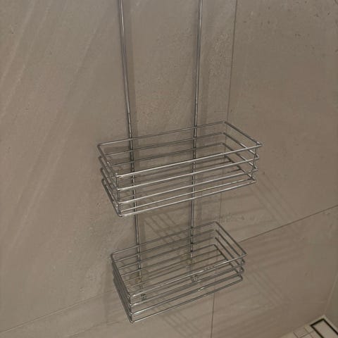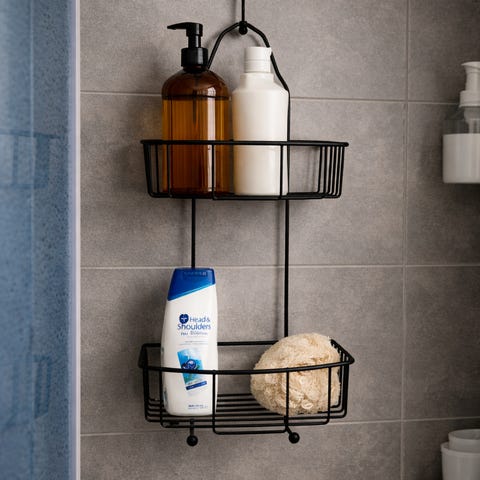 Dusjhylle med to kurver i svart metall. Hyllen henges over dusjvegg eller dusjdør og har flere kroker til oppheng av for eksempel kluter eller dusjtilbehør. De to kurvene gir plass til flasker, såpe og andre baderomsprodukter. Utførelse i metall med åpne trådkurver som gjør at vann renner lett av. Passer i de fleste dusjløsninger der det er kant å henge den på.