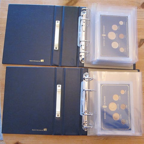 Hardplast myntsett, suvernir/moderne myntsett, proof sett, heritage/eksportsett, 20kr blisterpakninger, nye myntrekken, barnets myntsett