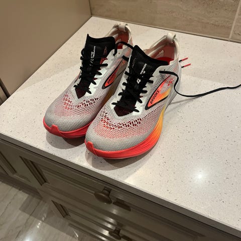 Ekstremt lette carbon løpesko. Brukt to ganger ute på tørr asfalt, og en håndfull økter på mølle. Et nummer for store til meg.