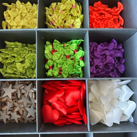 Blandede dekorasjoner og perler til hobby og scrapbooking. Inneholder ulike typer småpynt i flere farger og former, blant annet blomster, hjerter, stjerner og andre figurer. Leveres både i sortimentsbokser med rominndeling og i separate poser. Egnet til kortlaging, scrapbooking, dekor av gaver, DIY-prosjekter og annen kreativ hobbybruk.