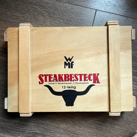 Settet består av 6 steakkniver og 6 gafler i rustfritt stål. Leveres i trekasse med lokk og innvendig inndeling til bestikket.