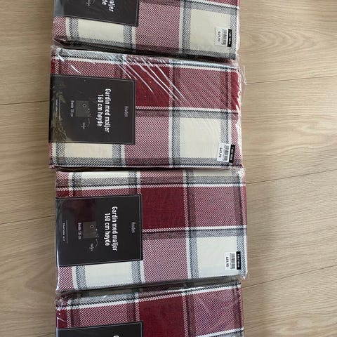 Passer til stue, soverom eller andre rom der man ønsker gardiner med mønster og nøytrale jordfarger. Materialet fremstår som vevd syntetisk stoff .