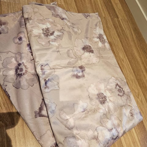 Sett med flere lengder, med store maljer øverst for enkel oppheng på gardinstang. Stoffet har et dekorativt blomstermønster i ulike nyanser av brunt og beige, med kombinasjon av helfarget parti og mønstret felt.