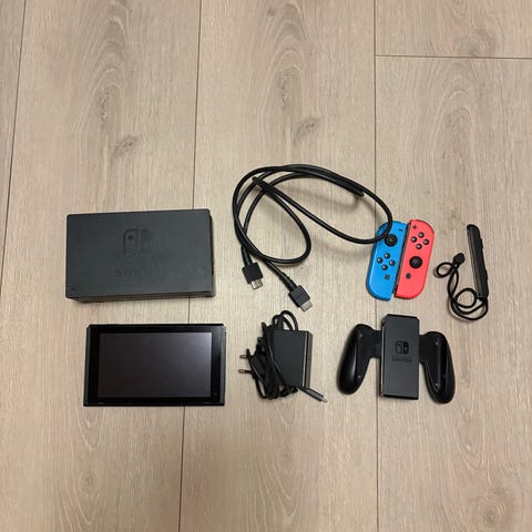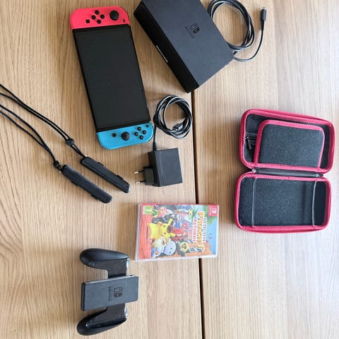 Selges med docking stasjon, joy-con pair, HDMI-kabel, 128 GB MicroSD kort, lader og laderledning ☺️ følger ikke med spill.