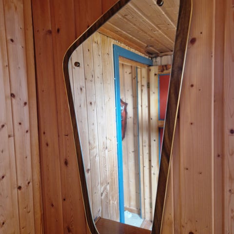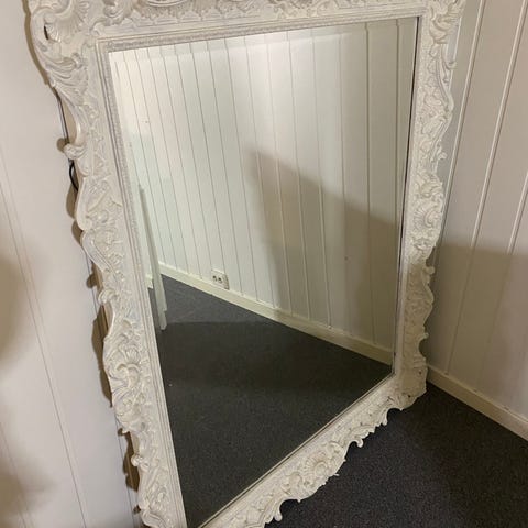 Et flott kvalitetsspeil med eikeramme. Rammen er brun. Mål: Lengde 93 cm og bredde 47 - 35 cm (smalner nedover).