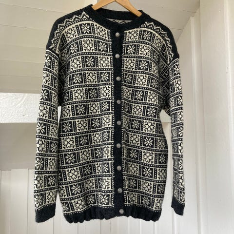 Behagelig hjemmestrikket kardigan/kofte/genser med mønster, str. XL; veldig fin stand:) ingen flekker eller skader; myk ullgarn som ikke klør; flott genser for hverdag eller på hytta:)
