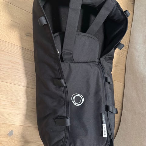 Bagen glidelåsåpning, samt festehemper på sidene for montering på kompatibel Bugaboo-vogn. Egnet som liggedel for spedbarn i kombinasjon med passende understell fra Bugaboo, og gir skjermet og myk plass til barnet på trilletur.