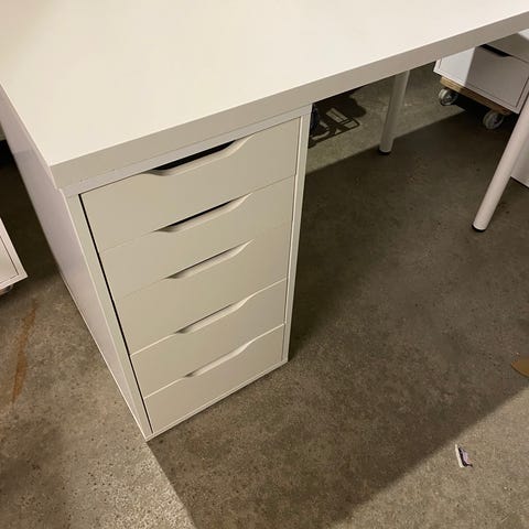 Brukt, noen slitasjemerker. Må hentes. Består av 2 stk skuffeseksjoner, en skapseksjon og en skrivebordsplate( kuttet av til ca, 130 cm.)