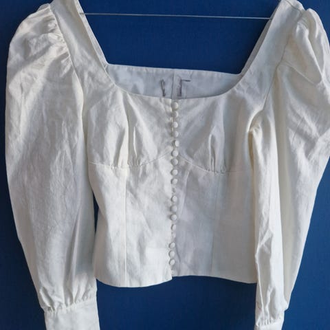Lett skjorte/bluse/bunadskjorte i ivory farge (MOS the label), str. 8/34; helt ny, med lappe på:) 100% lin (brodert i paisleymønster);