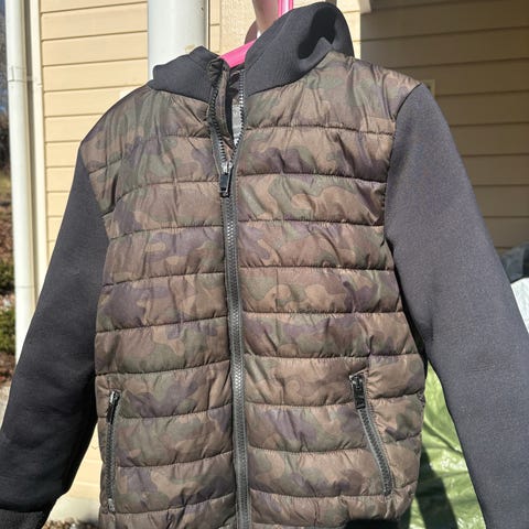 Lett jakke for barn i størrelse 134. Jakken er unisex og laget i polyester. Den har flerfarget design med kamuflasjemønster øverst og ensfarget parti nederst. Jakken har hette, hel glidelås foran og to glidelåslommer. Egnet som ytterjakke i overgangssesonger for barn i ca. 8–10-års alder.