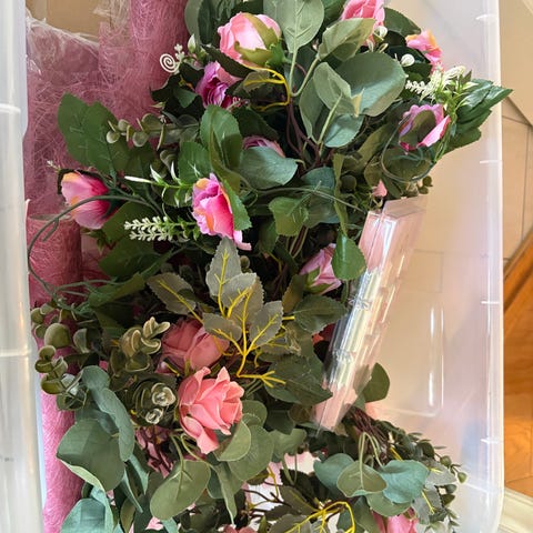 Kunstig hengende blomsterdekorasjon med tett grønn bladverk og store blomster i rosa og burgunder nyanser. Dekorasjonen består av ulike typer kunstige blader og blomster som gir et frodig uttrykk.