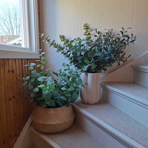 IKEA kunstige planter med potte. Pakken inkluderer to kunstige grønne planter i ulike høyder, begge plassert i potter. Plantene har grønne blader og er egnet som innendørs dekorasjon. Kan brukes i stue, gang, soverom eller kontor for å gi et grønt preg uten behov for stell og vanning.