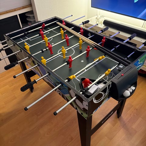 Bordfotballbord i treimitasjon med svarte bein. Spilleflaten er grønn, og figurene er montert på metallstenger med håndtak i plast. Lagene er markert med ulike farger. Bordet har målinnsamler på kortsidene og er egnet for innendørs bruk i hjemmemiljø, for eksempel i leke- eller oppholdsrom.og i tillegg biliard bord