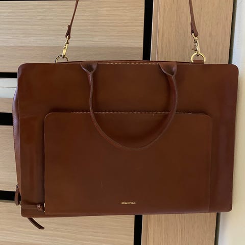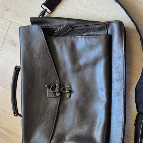 Selger en ubrukt royal republiq pc-veske i skinn. Den har avtagbar stropp til å bære den på skulderen.