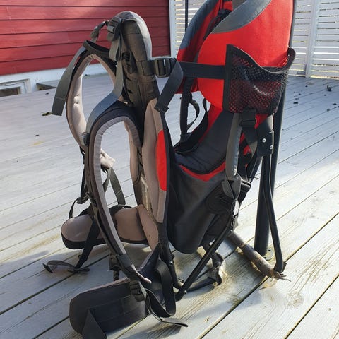 Enkel og solid bæremeis med sol-/regntak og praktisk oppbevaringslomme. Perfekt til turer i skog og fjell.