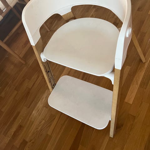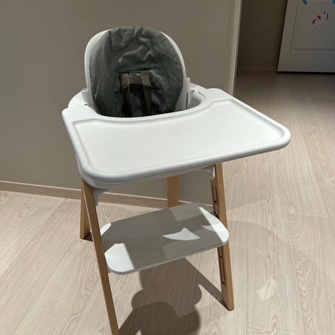 Flott barnestol fra Stokke i hardplast. Kan brukes med nyfødt sete til, stol med spisebrett. Kan kjøpes seperat og vokse med barnet. Jeg selger bare stolen og ikke annet utstyr. Ser helt ny it. Kjøpt på Siljes.