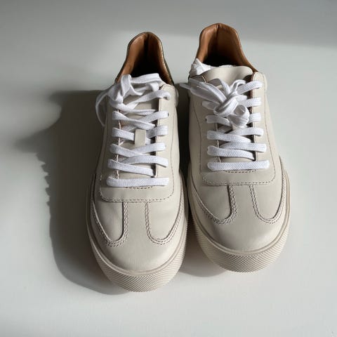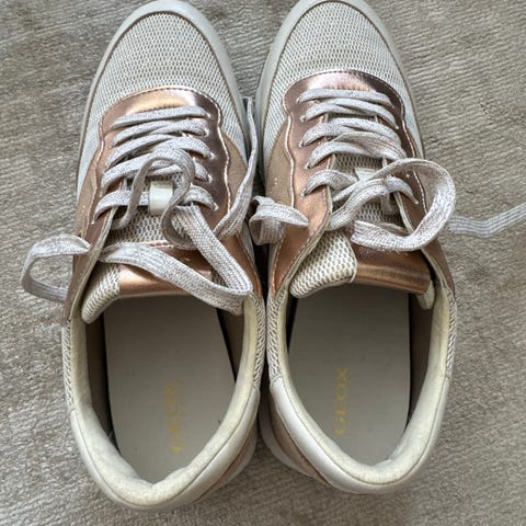 Geox Cruz sneakers i størrelse 41. Ekte skinn! Modellen er i hvit med kontrastfelt i lys brun/beige og brede lysegrønne/lysegule lisser. Sålen er kraftig med Geox sine karakteristiske ventilasjonselementer under. Fine både med jeans og kjole. Regnes som ortopediske sko, veldig gode å gå i. Kjøpt i Firenze i 2024 da flyselskapet klarte å miste bagasjen min. Kjøpet ble preget av hastverk, og jeg må innse at de er litt for store for meg. Derfor brukt veldig lite. Vil passe en helt normal norsk størrelse 41. Nyvasket og venter på ny eier som kanskje blir deg? 💛💚