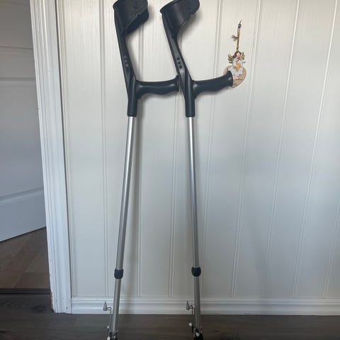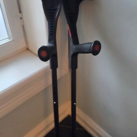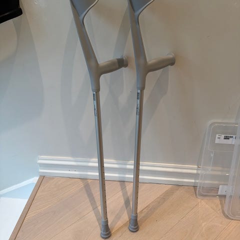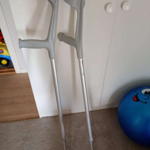 Mediq albuekrykker i grå plast og metall. Modellen er justerbar i høyden med teleskopiske rør, og har ergonomiske håndtak og underarmsstøtte. Egner seg for voksne som trenger støtte ved gange etter skade, operasjon eller ved nedsatt mobilitet. Leveres som et par.