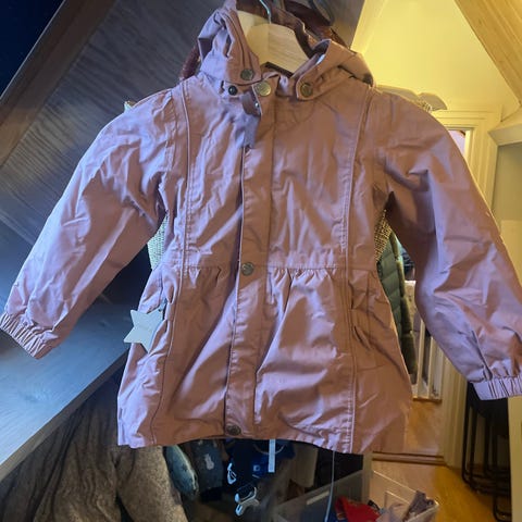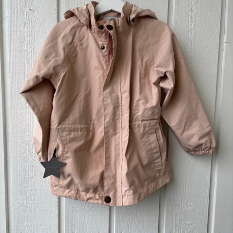 MINI A TURE Wilja jakke for barn i størrelse 104. Den har hette, glidelås og trykknapper foran, samt elastikk ved håndledd.