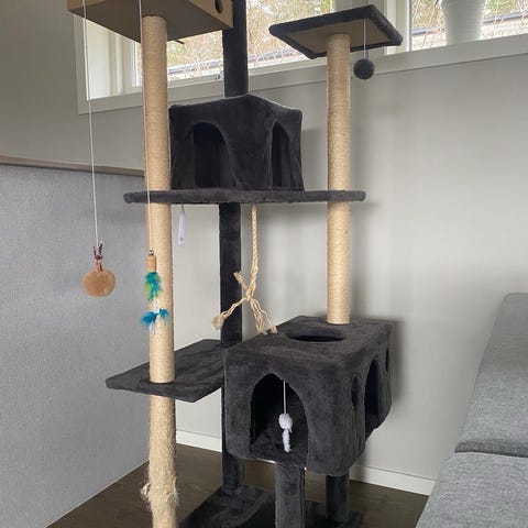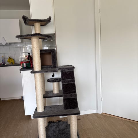 Klatrestativ for katt med flere nivåer og liggeplattformer i grått plysjtrekk. Stativet har flere vertikale stolper med sisal for kloring, samt en liten hule som gir katten et skjermet hvilested. Det er også rampe mellom nivåene for enklere adkomst. Egnet for innendørs bruk til lek, kloring og hvile for én eller flere katter.