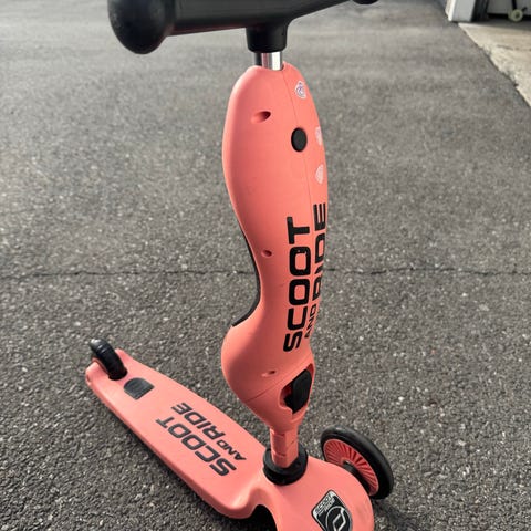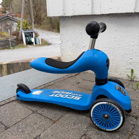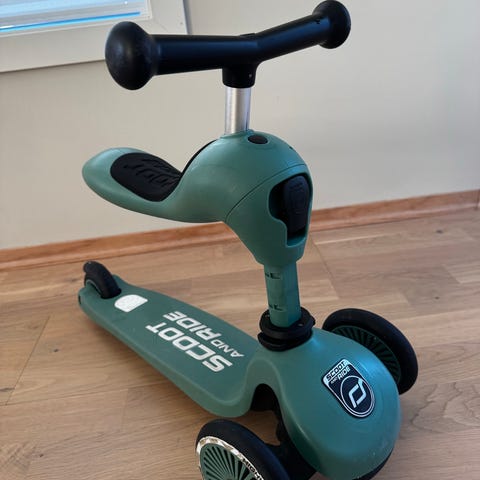 Scoot and Ride løpesykkel og sparkesykkel i turkis farge. Modellen har tre hjul med to foran og ett bak for økt stabilitet. Styret har T-form med håndtak tilpasset barn. Setet kan brukes som løpesykkel og kan justeres eller vippes slik at produktet også fungerer som stående sparkesykkel. Egnet for små barn som trenger et stabilt kjøretøy til lek og trening av balanse.