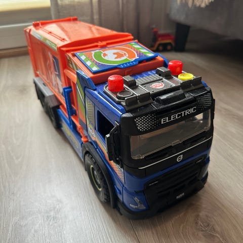 Mr. Dusty søppelbil med lyd og lys som samler opp leker. Kjøpt ny til jul og brukt kun ett par ganger da denne ble litt for skummel for sønnen.