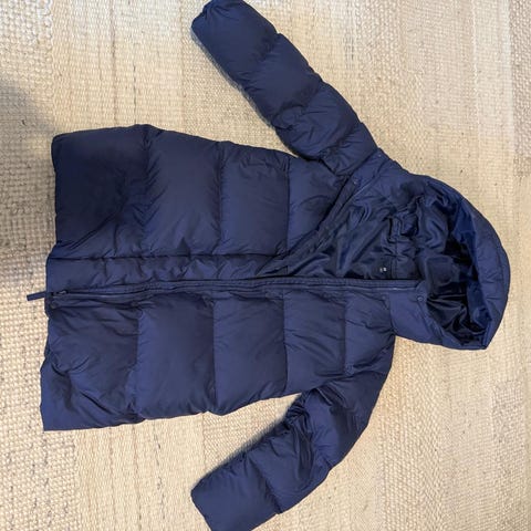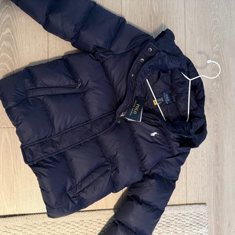 Polo Ralph Lauren dunjakke for barn/unisex i størrelse 152. Jakken er mørkblå og fylt med dun, en skikkelig varm og god jakke. Den har hette, glidelåslukking foran og glidelåslommer i sidene. Det er str 14-16 år, men liten i størrelsen, så passer for ungdom 10-14 år.