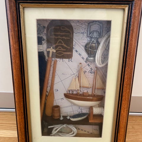 Serveringsfat som har vært hengt opp på veggen for pynt. Maritimt seilpreg.