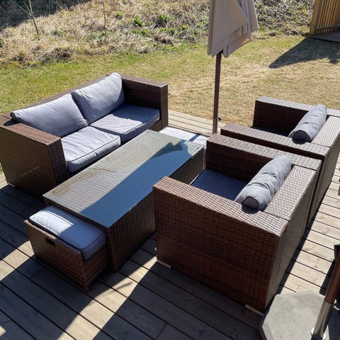Hagesett loungesett i grå kunstrotting. Settet består av to stoler, en toseters benk og et rektangulært bord med mørk bordplate. Alle sittemøblene har lyse sitteputer. Passer til uteplass, terrasse eller hage som sittegruppe for flere personer.