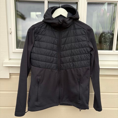 Jakken er svart og har vattert frontpanel med horisontale sømmer og glidelås i full lengde. Ermene og sidene er i glatt stoff for bedre bevegelighet. Ytterstoff, fôr og fyll er i 100 % polyester. Jakken har høy krage og to sidelommer med glidelås. Egnet som lett ytterjakke eller mellomlag til ulike aktiviteter og hverdagsbruk.