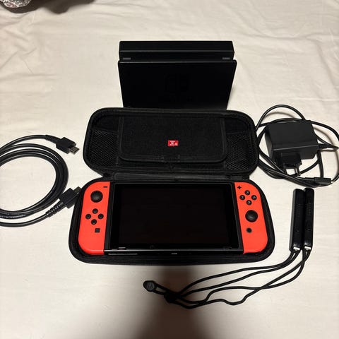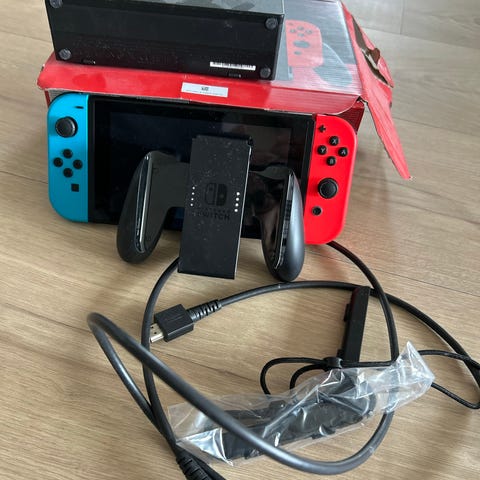 Nintendo Switch spillkonsoll med neon rød og blå Joy-Con-kontroller. Konsollen kan brukes både som håndholdt enhet og kobles til TV via dokkingstasjon. Bildene viser hovedenheten, dokkingstasjon, Joy-Con-kontrollere, Joy-Con-håndtak og tilbehør som reimer og kabler. Egnet for én eller flere spillere, både hjemme og på farten.