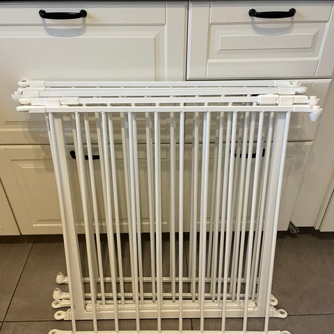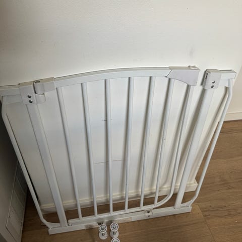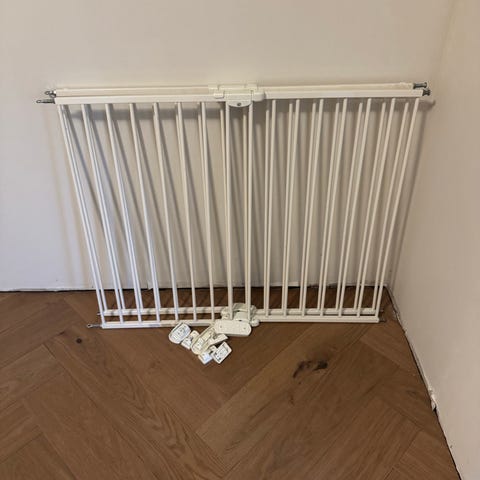 Selger 2 stk sikkerhetsgrinder med forlengerdel på 18cm. Kun tatt ut av eske og forsøkt montert før vi oppdaget at det ble feil mål for oss. Kan brukes til å sperre av åpninger, døråpninger eller trapper. Festes med dobbeltsidig teip eller skrue til vegg. Følger med monteringsdeler og bruksanvisning som vist på bildet. Egnet for innendørs bruk der man ønsker å hindre små barn i å nå bestemte områder.