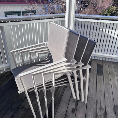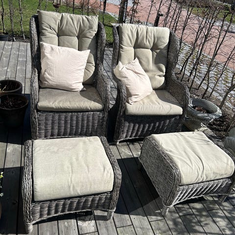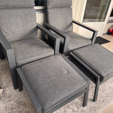 Funksjonen som gjør at ryggen går opp og ned sluttet å virke første sesong, så den ene stolen er svakt liggende og den andre rett opp. Ellers som ny. (Antar det kan repareres).