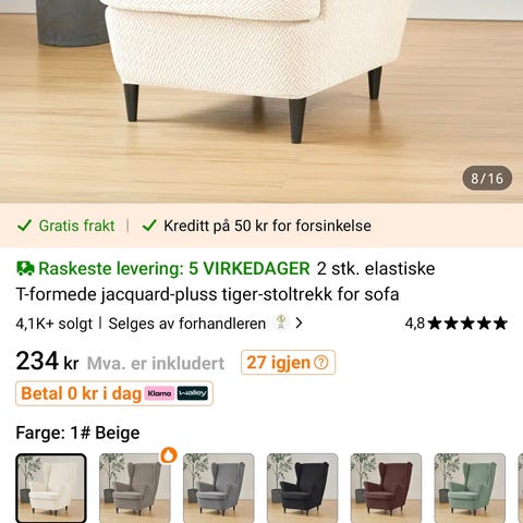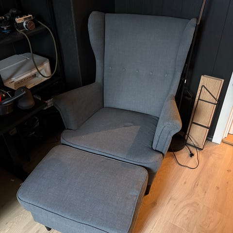 Brukt ørelappstol med fotskammel fra Ikea selges