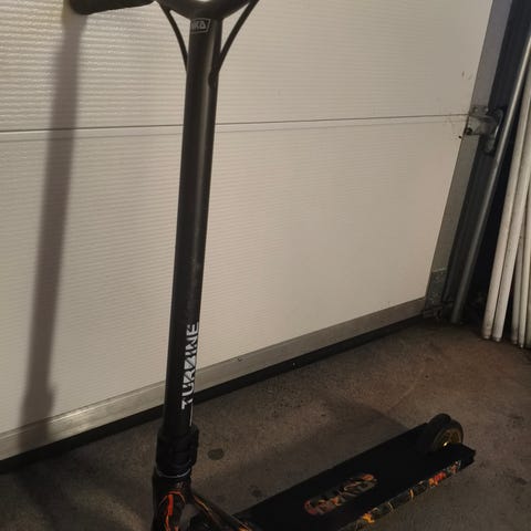 Sparkesykkelen er godt brukt og har bruksmerker etter vanlig bruk, men fungerer fortsatt fint. Perfekt for deg som vil ha en rimelig sparkesykkel til å øve på triks eller bare bruke til lek og moro.