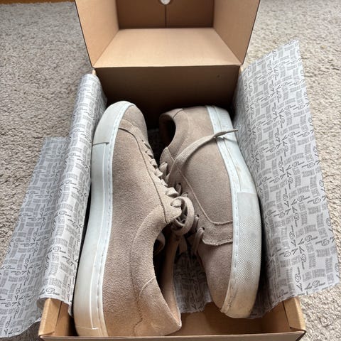 Veja Campo Suede sneakers i størrelse 44. Modellen har semsket overlær i lyse beige toner (fargenavn Pierre Almond Eagle) med ton-i-ton Veja-logo på siden og mørkere yttersåle. Klassisk snøring foran og lav hælkappe.