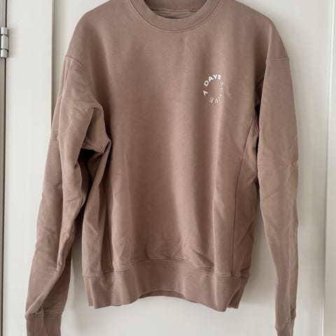 Beige collegegenser med artig print på ryggen. Str. S. Pent brukt.