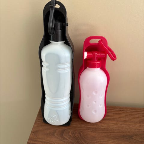 Minimalt brukt praktisk turdrikkeflaske til hund med metall og rød kork, selges.