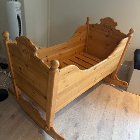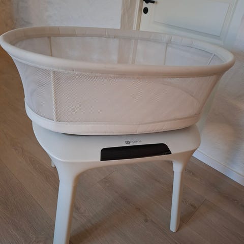 4moms vugge i treverk i hvit farge. Vuggen har klassisk utforming med hode- og fotende i heltre og sprosler i bunn for madrass. Egnet som soveplass for spedbarn og små barn. Kan plasseres på barnerom eller i andre rom der man ønsker en fast soveplass til baby.