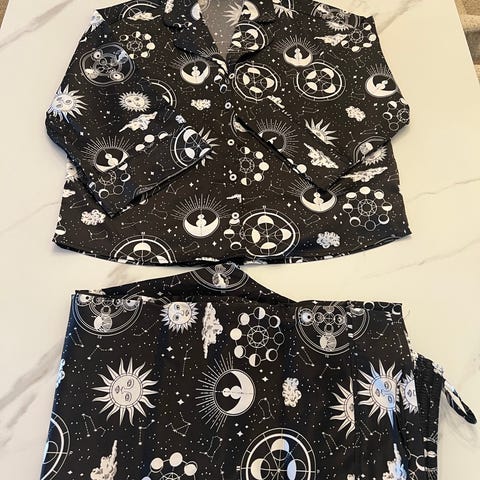KappAhl pysjamas for jente i størrelse 146/152. Sett med langermet overdel og lang bukse. Farge svart med mønster. Materiale i bomull for myk og behagelig bruk. Egnet som nattøy for barn i aktuell størrelse.