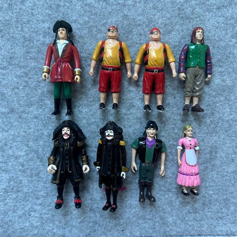 Gamle / vintage figurer fra kaptein sabeltann sin verden. Langemann er i god stand. Pelle/pysa i god stand men mangler litt farge på høyre kinn, Sunniva mangler bein og en halv flette.