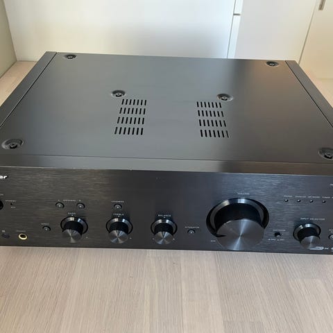 På fronten finnes volumkontroll, inngangsvelger, balanse- og tonekontroller, samt brytere for ulike funksjoner. Enheten er merket «Stereo Integrated Amplifier» og «New Class A» på fronten.