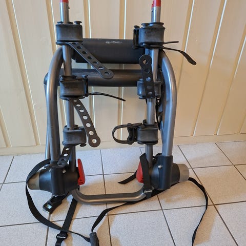 Sykkelstativ til bil for montering på hengerfestet. Stativet er laget i metall med grå overflate og har flere justerbare fester for sykler. Det er utstyrt med feste til hengerfeste på bilen og holder 3 sykler på plass. Egnet for transport av flere sykler, avhengig av størrelse og vekt. Passer til biler med hengerfeste. Følger med feste for skilt og lys