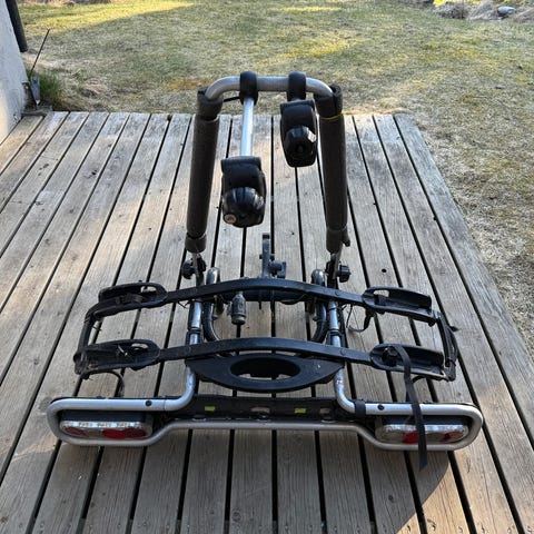 hengestativ for 3 sykler for tilhengerfeste vippbart sølv med skiltfeste og lys. Pris Thule 3000.