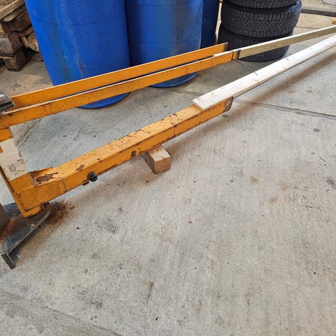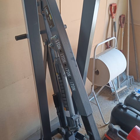 Hydraulisk motorkran med maksimal løftekapasitet på 1 tonn. Kranen er sammenleggbar og utstyrt med hydraulisk sylinder og løftearm med flere posisjoner for justering av kapasitet og rekkevidde. Passer til løfting og håndtering av motorer og andre tunge komponenter i garasje eller verksted. Stålramme med hjul for enkel forflytning på jevnt underlag.