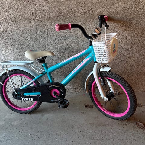White barnesykkel 16" i turkis, hvit og rosa. Sykkelen har 16-tommers hjul med rosa felger og dekk tilpasset bruk på asfalt og grus. Den er utstyrt med heldekkende kjedekasse, skjermer foran og bak, bagasjebrett bak og støtte. Foran sitter en hvit kurv i plast festet til styret. Sykkelen har rett styre med håndbrems til forhjul og «tråkke baklengs» bremse for bakhjulet.