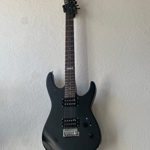 Schecter Omen 6 fra 2008 selges. Den er satt opp med 11-49 strenger (helt nye). Den har både riper og hakk, men båndene er fine og nypolerte og det er ikke merker etter strengene på dem. Det er heller ikke båndskjegg (fret Det bitte litt "fret rock" et par steder, men det er nesten ikke "fretbuzz" med strengehøyde på ca 1,9. Ingenting høres i forsterker. Halsen er mattet litt ned for raskere følelse.