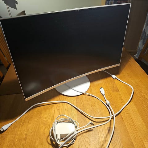 Fin skjerm til hjemmekontor. 27-tommer. Erstatta den gamle 24-tommeren min med denne, men etter noen måneder kjøpte jeg en 32-tommer istedenfor. Denne er dermed beskjedent brukt og framstår som ny. Ingen problemer med den som døde piksler eller annet. Har original emballasje.