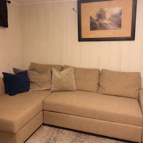 Selger en praktisk "Friheten" hjørnesovesofa fra IKEA i fargen Skiftebo mørk grå. Nypris for sofaen er 6000 kr., og den ble kjøpt i 2022 (kvittering medfølger).